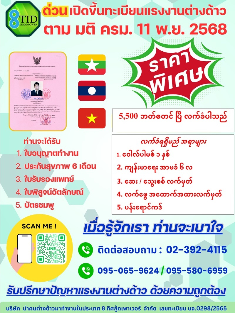 บริษัท นำคนต่างด้าวมาทำงานในประเทศ 8 ทิศกู้ดเพาเวอร์ จำกัด บริการรับจัดหา และนำเข้าแรงงานจากประเทศเพื่อนบ้าน เมียนม่าร์, ลาว, และกัมพูชา ดำเนินงานอย่างถูกกฎหมาย ตามบันทึกข้อตกลง MOU โดยทีมงานบริษัทของเรามีความชำนาญงานในด้านการนำเข้าแรงงานต่างด้าวทุกประเภทอุตสาหกรรม พร้อมทั้งให้คำปรึกษา แนะนำขั้นตอนการจัดการอย่างตรงไปตรงมา ซึ่งจะทำให้ท่านหมดกังวลเกี่ยวกับเรื่องการใช้แรงงานผิดกฎหมาย หรือเรื่องแรงงานหลบหนีเข้าเมือง ที่มีผลทำให้เกิดความเสียหายต่อธุรกิจโดยรวมของท่านได้ หากท่านมีความสนใจรับบริการ หรือมีข้อสงสัยเกี่ยวกับเรื่องแรงงานต่างด้าว รวมถึงบริการรให้คำปรึกษา และ วางแผน ในการยื่นประกันสังคมสามารถติดต่อสอบถามกับทางบริษัท เรื่องแรงงานพม่า, ลาว, กัมพูชา ทั้งสามประเทศได้ที่นี่